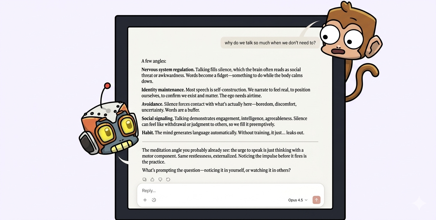 I started with the simple question: “Why do we talk so much when we don’t need to?”, to which Claude spat out a wall of text that felt weirdly personal towards the end…