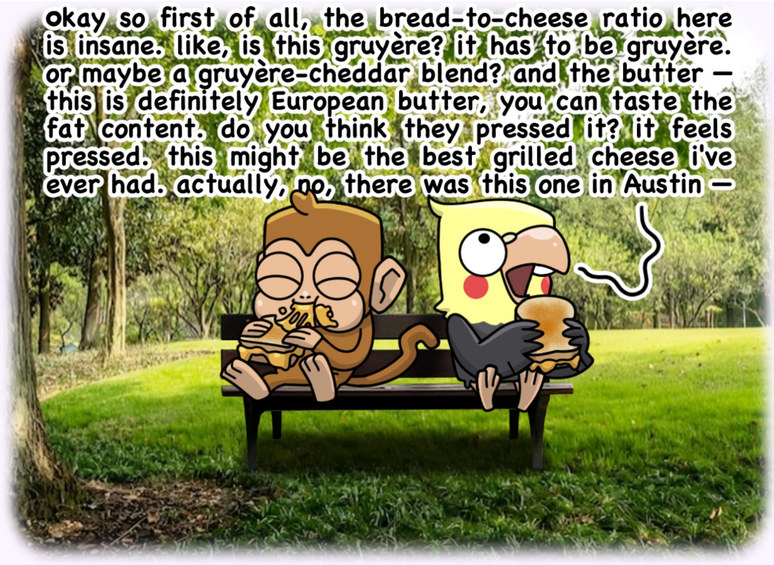 So instead, the Grabber talks. It finds something to label and process. It finds something to make meaning out of, like bread-to-cheese ratios.
