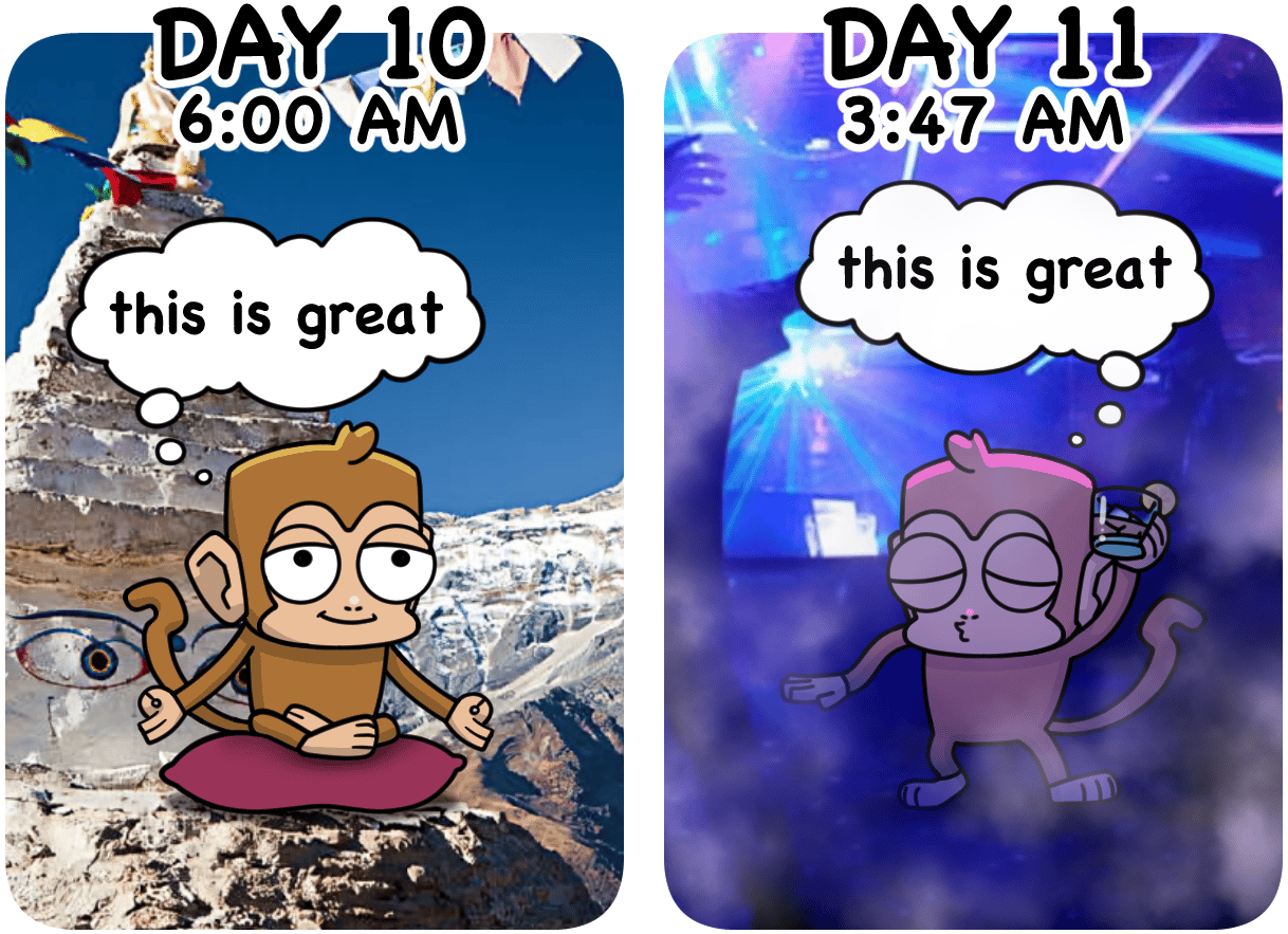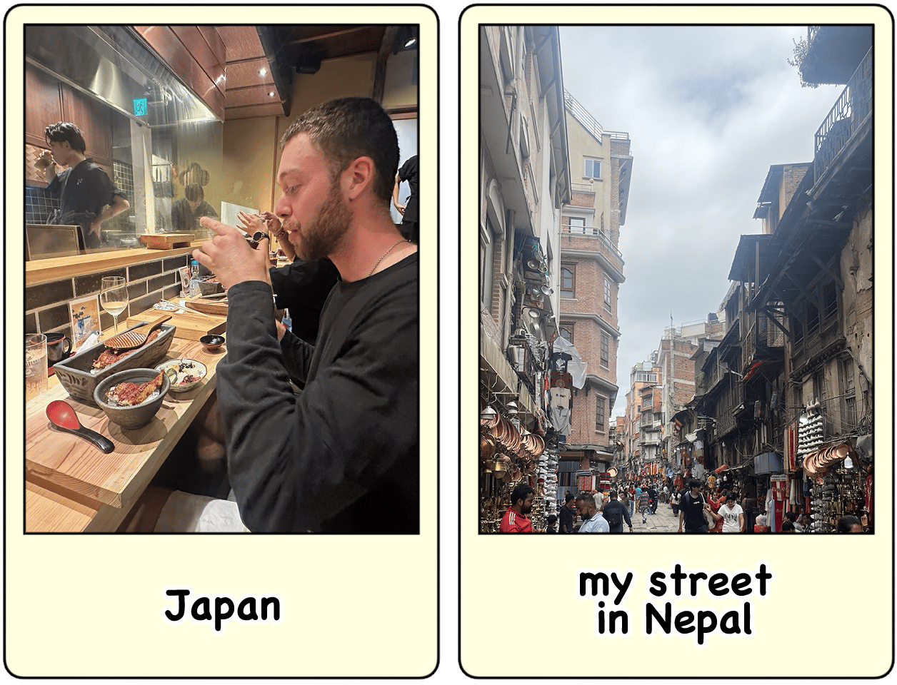 Actually feeling what it's like to be offline for a day and then to scroll TikTok deep into the night. Sitting in silent meditation and going to all-night ragers. Eating $75 omakase dinners in Japan and staying at $5 hostels with questionable hygiene standards in Nepal.
